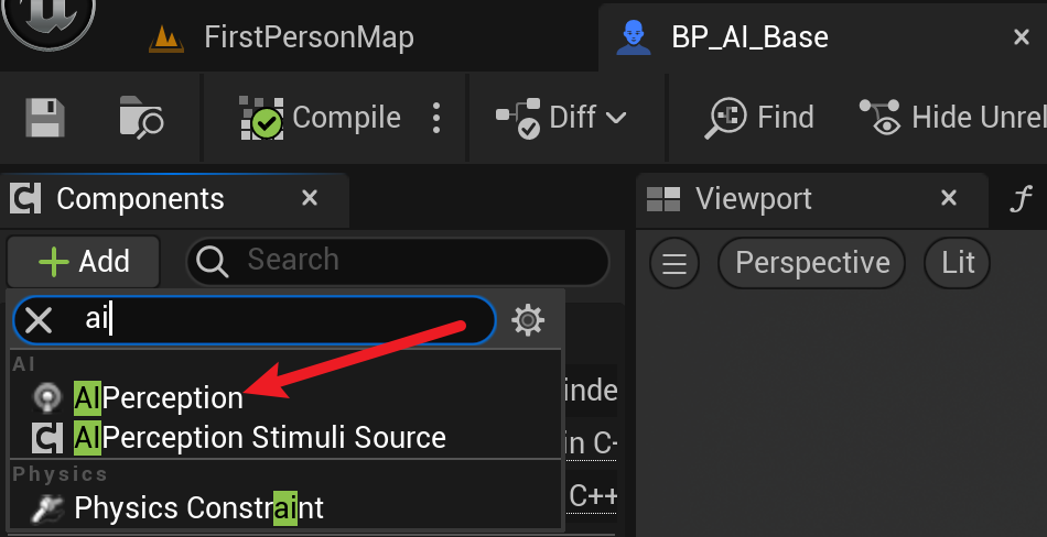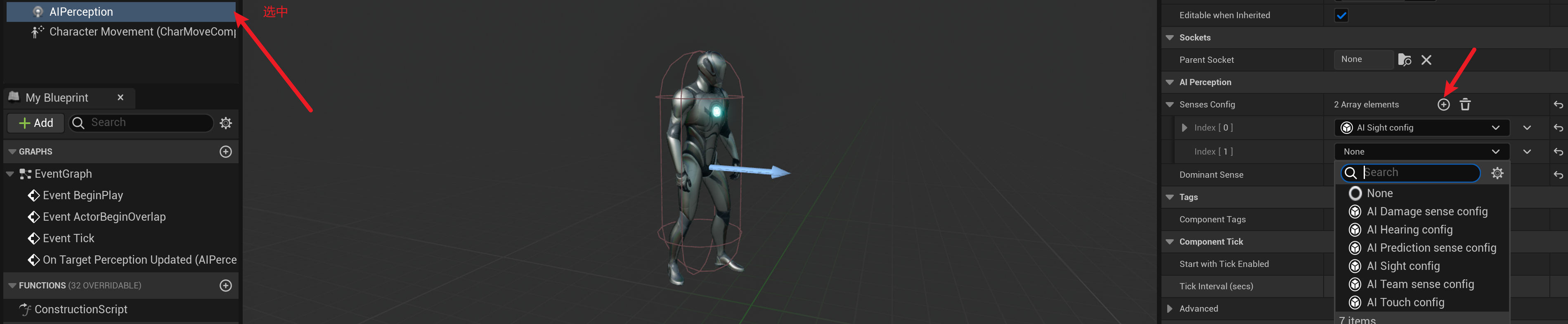 想要启用AI感知,首先要给角色添加一个AI感知组件(AIPerception)。